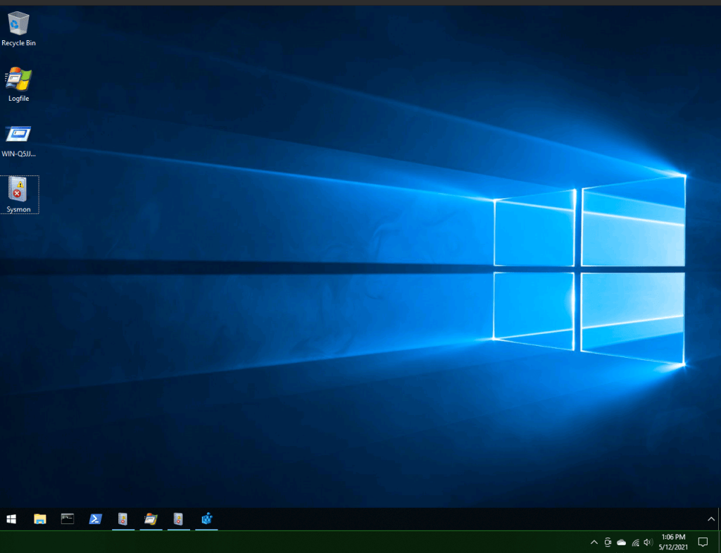 The first is “Logfile” which is actually a Procmon save; second is an autorun file labeled “WIN-Q5JJRDM876J”; and third is an event viewer log labeled “Sysmon.” Note that these are saved states: the machine also has each of these respective programs, but these saved states will be a goldmine for the investigation.