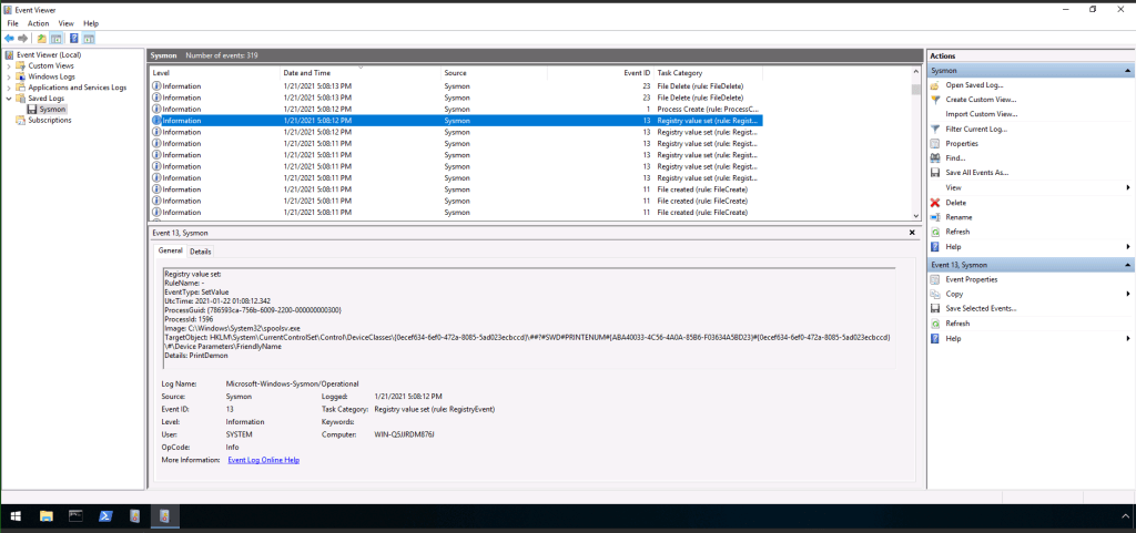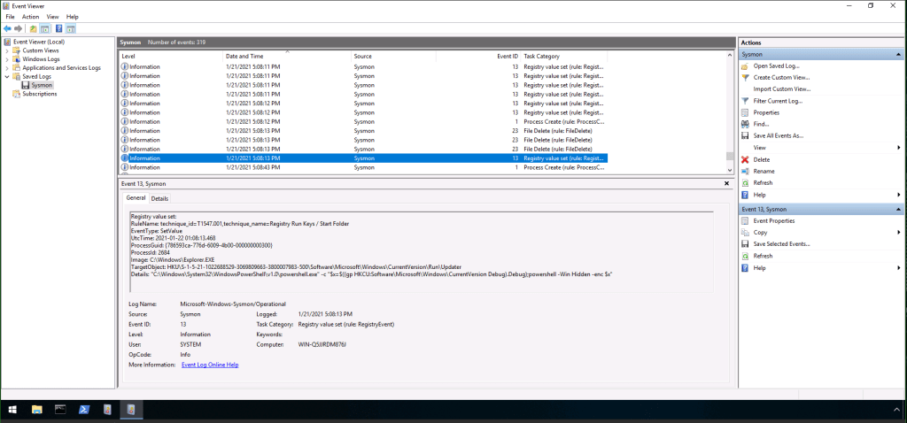 Good question: I looked at the Sysmon Event Viewer. Why? I’m a big fan of approaching forensics examinations from a chronological and psychological view: in other words, what did the attacker hit first, and if I can’t find the relevant events I need to reconstruct the attack, I ask myself “If I was the attacker, what would I try next?” I literally ask this over and over again throughout an investigation. This tends to help narrow down the search scope.