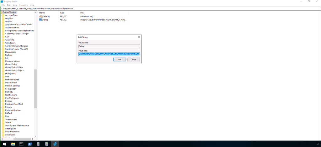 Look closely at the event I pointed out in step 4 above: what is this encoded payload doing? It’s doing something to the registry. With that in mind, we need to open up reg edit (registry editor) and go to the registry location you found in question 1. In the Debug value field, you find a randomized string.