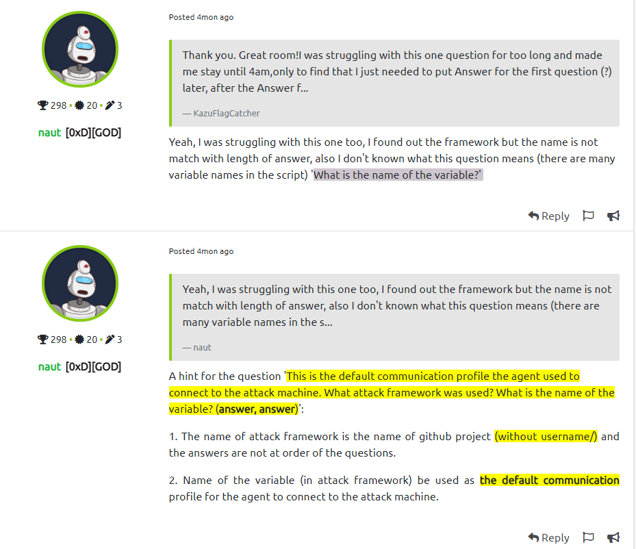 So what we are looking for is the name of the GitHub project name and the default communication profile for the agent to connect to the attack machine. We should also note that naut pointed out the answers do not run in the order of the questions, so we need to put the answer to first question second and vice versa.